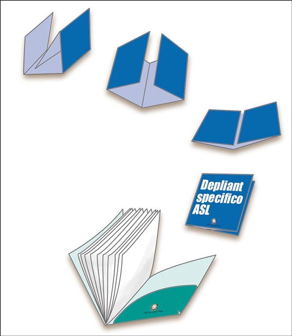 Nello specifico: un opuscolo formato A5 con informazioni di carattere generale, con una tasca contenente un opuscolo in A6 con informazioni specifiche della ASL a cui e’ indirizzato.